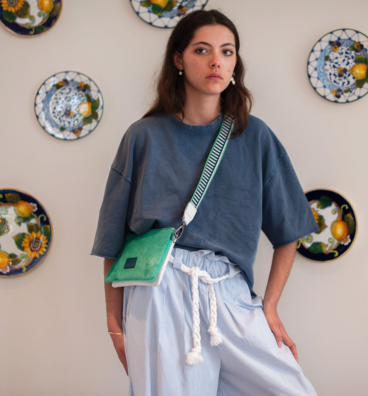 Le tout relié par une sangle turquoise rayée tissée en Grèce